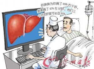 “患者親妹妹為他捐了69%右肝、堂弟捐了45%左肝,供受三方均穩定平安,兩位供體三個月后肝臟可再生回95%,完全可以恢復正常的工作、生活。”中山一院副院長何曉順教授告訴記者,一切數據都是經過嚴格精細計算,“切多了供體會出現肝衰,切少了受體不夠用。”他表示。