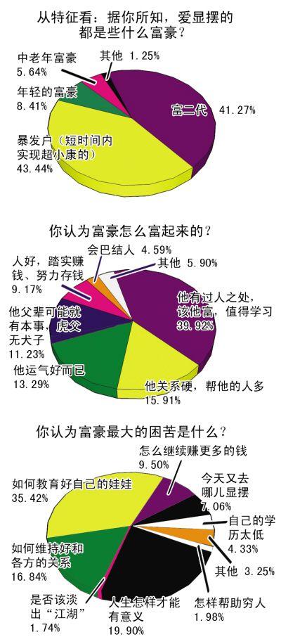 重慶社科院專家孫元明認(rèn)為,富豪總會(huì)被投以或羨慕,或嫉妒的眼光,這引起無數(shù)圍繞“富豪”的話題。其實(shí)表明,人人都想變成富豪。在富豪的身上,無論你能挑剔出他多少缺點(diǎn)和不是,但不可否認(rèn)的是,富豪總有不同一般人的長處,他們或許是比你們更有毅力,更能吃苦,或者僅僅是更會(huì)交際,但這一個(gè)“更”字,就讓他們跨入了富豪的圈子。記者 王薇 見習(xí)記者 張思思 實(shí)習(xí)生 杜鑫