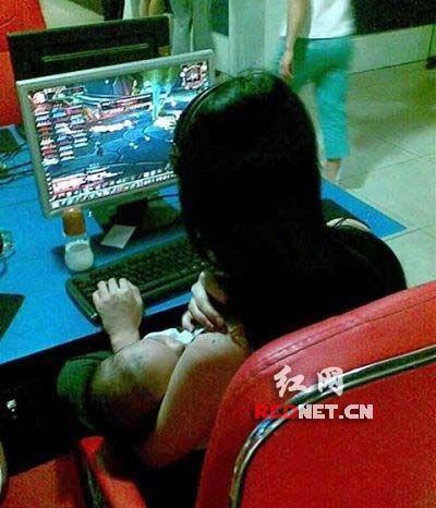 年輕女子懷抱吃奶嬰兒在網(wǎng)吧玩游戲。