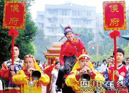 “我們家哪有傭人,這些丫鬟、家丁都是我的好友。”騎在黑馬上的新郎侯俊聽人說他家很富有,哈哈大笑起來。他說本來準備舉行的是西式婚禮,但由于以前在重慶已經舉辦過西式婚禮,就臨時改成了中式婚禮。當天參加婚禮的演員是原來的伴娘、伴郎臨時裝扮。“雖然事先沒有排練,但大家都很入戲。”