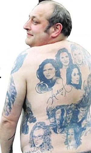 據(jù)英國(guó)媒體9日?qǐng)?bào)道,英國(guó)41歲男子斯蒂夫·波特(右圖)堪稱是一名“超級(jí)追星族”,在過去10來年中,他將自己最喜愛的24名歐美影星和搖滾歌星的頭像都文在了自己的前胸、后背、臂膀以及大腿上。其中的12個(gè)明星還在波特的身體皮膚上留下了各自的親筆簽名。每當(dāng)一個(gè)明星用筆在波特的皮膚上簽名后,波特就會(huì)立即趕往一個(gè)文身藝術(shù)家的工作室中,請(qǐng)文身藝術(shù)家將他最新得到的名人簽名也永久性地文在他的皮膚上。據(jù)悉,波特目前計(jì)劃申請(qǐng)吉尼斯世界紀(jì)錄。