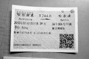 倪先生說,日前,他在論壇看到有人說能買到這么便宜的火車票,覺得很好奇,就去了家門口的一家火車售票點,買到了5毛錢的硬臥火車票,外加5塊錢手續費,“那個賣票的小伙子都震驚了,他都不知道有這么便宜的票。”倪先生,這兩站之間有八九公里,坐公交車按照當地價格得一塊錢吧。”記者看到,這是一張1月13日哈爾濱東開往哈爾濱的T244次新空調硬臥中鋪票,價格處印著“0.5元”。倪先生說,他買這張票只為收藏,不會真的去乘坐。