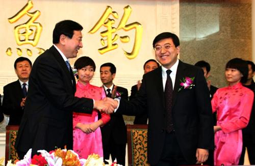 阜新市市長潘利國(前排左)和伊利集團董事長潘剛(前排右)出席并簽署協議。