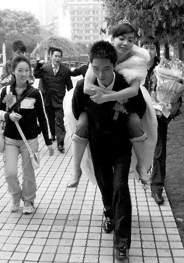 這是一場與眾不同的婚禮:沒有豪華的婚車,也沒有請婚慶公司,一身正裝的新郎背著新娘,從春熙路一直步行到位于二號橋的婚禮現場,親戚們也趕公交車赴宴。昨日,80后新人賀亮和袁文霞用這場極具環保理念的婚禮來倡導低碳生活。