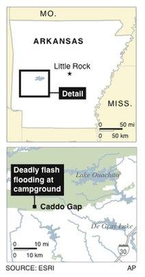 美國阿肯色州一個著名旅游度假區11日清晨遭遇猛烈洪水襲擊,至少有16名游客因被洪水卷走而喪生,還有40多人下落不明。事發前夜,當地連降傾盆暴雨,結果造成河水以每小時2米多的速度猛漲,沿河兩側的多個野外宿營地中的300多人因此在睡夢中不幸遭遇了滅頂之災。