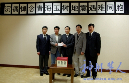 2010年4月21日上午,在韓中國留學生會會長李忠輝等代表全體留學學人向地震災區捐款,駐韓中國大使館張鑫森大使接受了留學生的自愿愛心捐款。