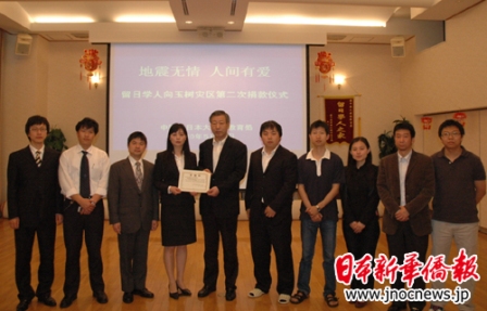 中新網(wǎng)那個(gè)5月28日電 據(jù)日本新華僑報(bào)網(wǎng)報(bào)道,5月25日上午,全日本中國(guó)留學(xué)生學(xué)友會(huì)副會(huì)長(zhǎng)韓冰以及東京大學(xué)、東京工業(yè)大學(xué)、早稻田大學(xué)、埼玉大學(xué)、東京海洋大學(xué)、千葉大學(xué)、日本大學(xué)等7所大學(xué)的中國(guó)留學(xué)生學(xué)友會(huì)會(huì)長(zhǎng)和代表來(lái)到教育處,將留日學(xué)子為青海省玉樹地震災(zāi)區(qū)募集的第二批賑災(zāi)款送到了教育處。第二批捐款總計(jì)日幣2,861,295元、人民幣1,000元。孫建明公使銜參贊代表教育處接受了來(lái)自留日學(xué)子的第二筆愛心捐款。
