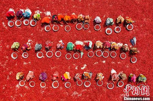 航拍孟加拉國工人曬辣椒 大地絢爛宛如油畫