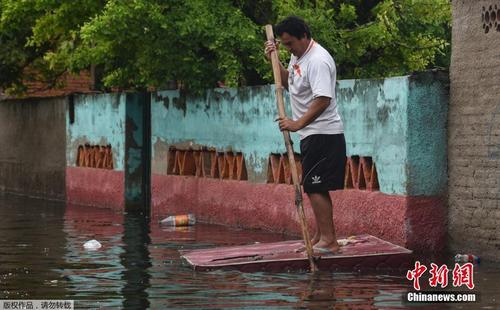 巴拉圭首都遭遇洪水襲擊 男子把床墊當“竹筏”