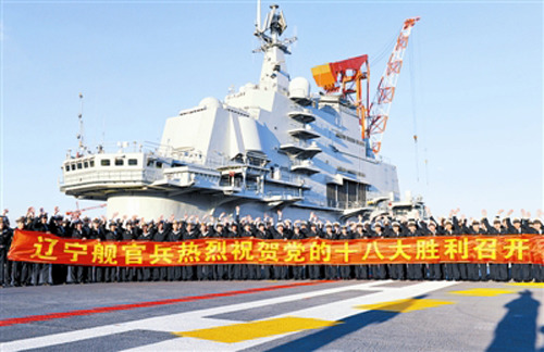 中新網(wǎng)11月8日電 據(jù)中國軍網(wǎng)海軍頻道報道,11月7日,我軍首艘航母、海軍“遼寧艦”上千名官兵展開鮮紅的彩色條幅,高聲歡呼,歡慶黨的十八大勝利召開。