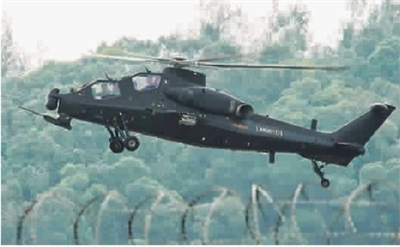 據現場實景推測,武直-10屬于中型專用武裝直升機,配備2臺大推力渦軸發動機,機體采用串列式雙座布局,機身中部兩側帶有短翼,每側短翼安置2個武器掛點,可攜帶激光制導反坦克導彈、制導火箭巢乃至對空格斗導彈。