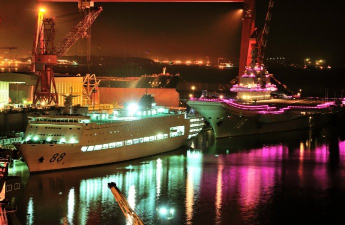 “遼寧艦”節(jié)日期間霓虹燈閃亮裝點海灣