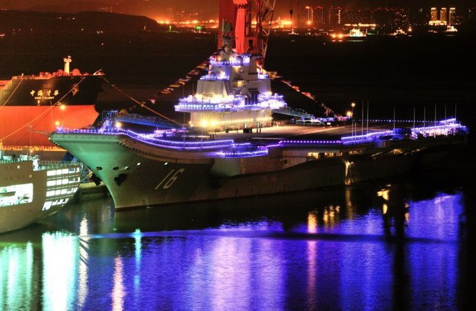 “遼寧艦”節日期間霓虹燈閃亮裝點海灣