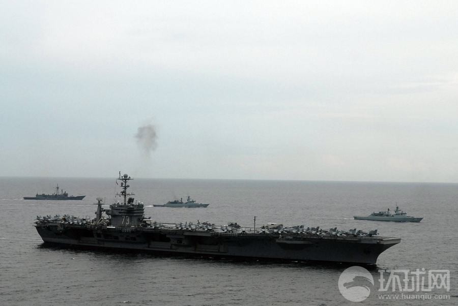 馬來西亞海軍戰艦與美軍華盛頓號航母組成編隊航行