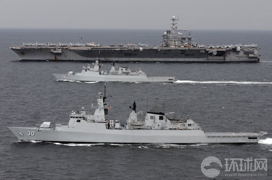 馬來西亞海軍戰艦與美軍華盛頓號航母組成編隊航行
