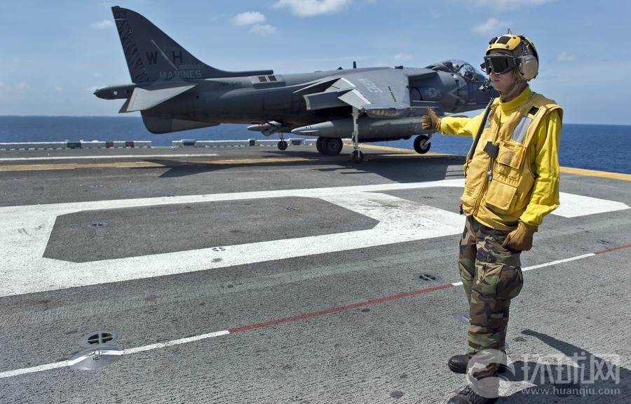 在此次美菲聯(lián)合登陸演習中,一架AV-8B鷂式戰(zhàn)斗機從好人理查德號兩棲攻擊艦上起飛。