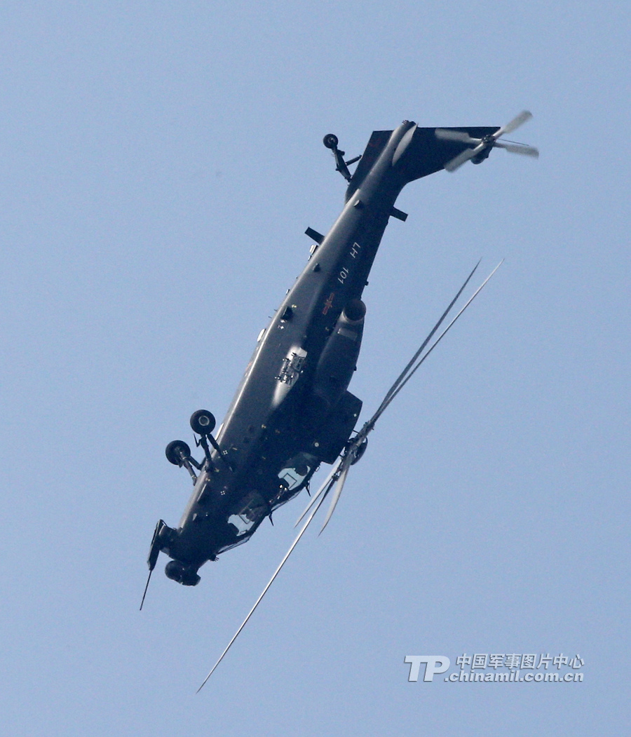 11月13日,我國(guó)自主研制生產(chǎn)的武直-10武裝直升機(jī)亮相在珠海舉行的第九屆中國(guó)國(guó)際航空航天博覽會(huì),飛行表演展示了這款直升機(jī)的優(yōu)良性能。圖為武直-10七十度角度背飛。記者喬天富攝