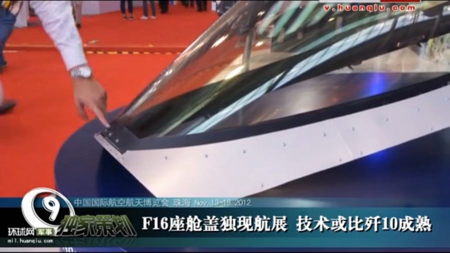 參展商英國漢堡森航空航天公司展出的F-16一體成形座艙罩(環球網視頻截圖)
