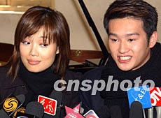 香港著名歌星容祖兒、2002年新秀冠軍吳浩康一月十日在香港為新歌《他都不愛我》拍攝MTV。圖為容祖兒、吳浩康接受記者采訪。錢興強 攝