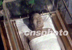中國長沙馬王堆國寶級文物——著名的西漢辛追貴夫人的遺體,十六日凌晨兩點成功搬入長沙博物館“新居”,既新建的現代化陳列館展覽地宮里。專家為貴夫人換了一個新的水晶玻璃棺,并灌注新的保護液。辛追夫人遺體在地下埋藏了兩千多年后,又經過三十年的保存和展覽,仍然完好無損。作者:中新社