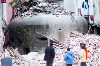 據人民網報道,漢口建設大道旁金惠公寓居民劉先生昨日憑欄遠眺時,突然發現建設大道拓寬工程拆遷處露出一座三四米高,如天文臺頂一般的圓頂龐然大物,仔細觀察,竟是一座碉堡。
