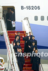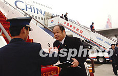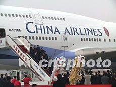 組圖:華航機(jī)組人員走下飛機(jī)受到舞獅歡迎