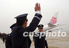 載有春節返鄉探親臺商及其眷屬的臺灣“華航”包機,一月二十六日上午十一時三十分左右從上海浦東機場順利起飛。圖為“華航”機組人員起飛前揮手作別。