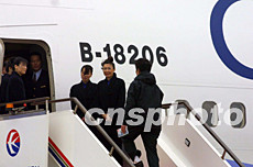 二十六日上午十點三十分,臺商開始陸續登上臺灣“華航”首架返鄉包機。圖為首位登機臺商走上舷梯。作者:湯彥俊