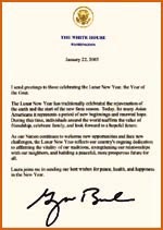 布什總統(tǒng)二十九日發(fā)布賀詞說,農(nóng)歷新年的傳統(tǒng)是慶祝大地復(fù)蘇和新的耕作時(shí)節(jié)的開始。如今,對(duì)于許多美國(guó)亞裔來說,它標(biāo)示著新開端和新希望的降臨。在這段時(shí)間里,世界各地的人們重新確認(rèn)友誼的價(jià)值,慶祝家庭團(tuán)圓,期待著一個(gè)充滿希望的未來。