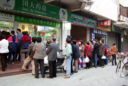 近來,廣東出現非典型肺炎病例的消息傳出后,廣東的廣州、深圳、珠海、東莞等地市民都自發積極采取預防措施,各地市民爭相購買白醋、板藍根、羅紅霉素、抗病毒口服液等藥品。廣州市內的各大小藥店生意分外地好,部分藥物已快脫銷。據廣州市藥材公司業務總部的消息,該公司板藍根沖劑、抗病毒口服液、抗病毒沖劑三種藥物的所有存貨已經全部批出,而目前正聯系各地廠家加緊生產,以最快速度投放市面。