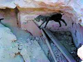 在盜墓現(xiàn)場,先見到幾座挖開的古墓,棺材板扔得到處都是,尸骨遍地。后是一座精美絕倫的古墓,它的位置很高,在一個(gè)高高的佛塔正下方。盜墓人從正上方打開洞進(jìn)入了墓室,墓室共有兩個(gè),第一個(gè)墓室內(nèi)有5具棺材,已經(jīng)被盜墓人破壞,滿地都是碎成一塊一塊的干尸、枯骨和絲綢殘片。最讓他們感到吃驚的是墓室墻上的壁畫,一峰金駝和一峰銀駝相互撕咬著,一個(gè)穿長袍模樣的人站在中間,打手勢讓兩駝分開;旁邊一頭奔牛怒目而視,振蹄欲奔。可惜此壁畫已被破壞,一具干尸躺在壁畫下。第二個(gè)墓室有4具彩棺被劈開,干尸及綢緞碎片扔得滿地都是。彩棺的顏色非常華麗。壁畫上一大群大臣模樣的人正在行禮,模樣栩栩如生。可惜此壁畫也被損壞了。