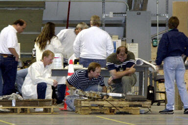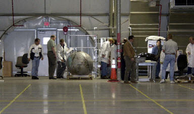 從路易斯安娜和德州經過分析對比后的“哥倫比亞”號殘骸被陸續運抵位于弗羅里達的肯尼迪航天中心,展開更深入的調查失事原因工作。圖為KSC工作人員接收殘骸物件進行匯總登記。