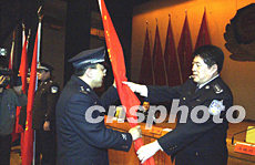 十四日,北京警方舉行治安系統“兩會”安全保衛動員大會,公安局長馬振川(右)為“兩會”治安保衛突擊隊授旗。作者:任海霞