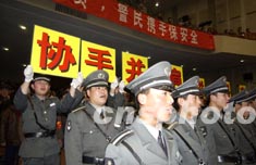 北京西城警方二月十八日舉行“兩會”保衛誓師大會,來自公安、武警、工商、城管、保安等相關部門的兩千余人參加了大會。作者:任海霞