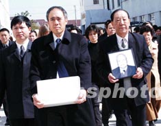 二月二十日,世界著名高能物理學家袁家騮教授的骨灰,在其親屬及江蘇省太倉市官員、太倉市明德中學代表的護送下,從北京運抵故鄉太倉安葬。當地明德中學的學生前往迎接。袁先生生前曾先后捐助明德中學五百余萬元,幫助明德中學建起了科技樓,明德樓。作者:王大經