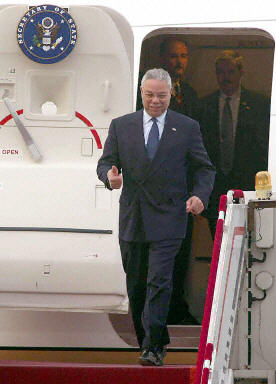 23日下午,美國國務卿鮑威爾乘坐的飛機抵達北京首都國際機場,開始對中國進行訪問。鮑威爾此行重點將是朝核、伊拉克問題。