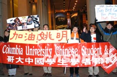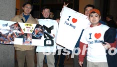 圖為紐約中國球迷穿著“我愛姚明”的T恤衫在場外迎候隊員到來。作者:龔文謨