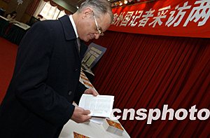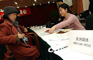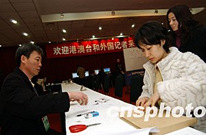 “兩會”新聞中心的工作人員接待的國外記者越來越多,美洲、歐洲、亞洲等多個洲的數家媒體已到達北京。圖為工作人員在為國外記者辦理“兩會”證件。作者:盛佳鵬