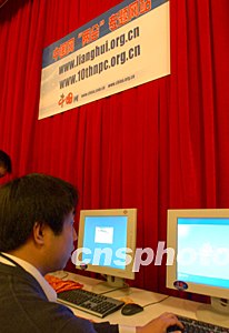 北京一家網絡媒體在“兩會”新聞中心安裝終端展示平臺,供中外記者查詢瀏覽“兩會”信息。作者:張煒