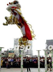 黃飛鴻獅藝武術隊三月初在廣州為市民進行醒獅表演,以紀念一代宗師黃飛鴻在廣州西關設館一百四十周年。作者:劉衛勇