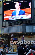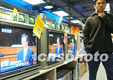 素有購物天堂美譽(yù)的香港,商家關(guān)注稅務(wù)制度改革。三月五日公布的香港2003至2004年度財(cái)政預(yù)算案成為此間商家關(guān)注熱點(diǎn),圖為電器店里的電視機(jī)播出財(cái)政司司長(zhǎng)梁錦松提交的預(yù)算報(bào)告。潘索菲 攝