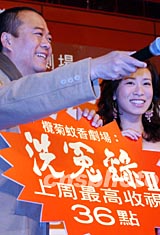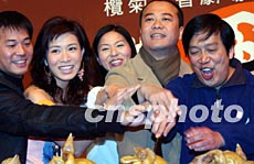 無線電視藝員歐陽震華、佘詩曼、歐錦堂、滕麗名及劇目監制蕭顯輝等演員,3月9日在慶祝該劇目收視率取得佳績時與觀眾玩游戲。洪少葵 攝