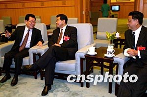 全國政協(xié)十屆一次會議第四次全體會議十三日舉行,會議將選舉出全國政協(xié)新一屆領導人。圖為李瑞環(huán)、賈慶林、王忠禹在大會間隙切磋網(wǎng)球球技。作者:鄭萍萍