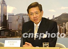 香港衛生福利及食物局局長楊永強三月十三日就香港應付非典型肺炎所采取的措施舉行記者會,他表示,威爾斯親王醫院爆發非典型肺炎病癥,亦令世界衛生組織關注。潘索菲 攝
