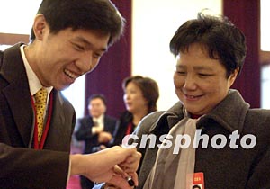 全國政協十屆一次會議閉幕大會十四在京舉行。全國政協委員、鄧小平之女鄧楠在會前為工作人員簽名留念。作者:廖文靜