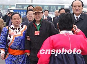 全國人大代表趙本山三月十五日前往北京人民大會堂參加十屆人大一次會議的選舉,一邊走一邊應其他代表的請求合影。作者:賈國榮