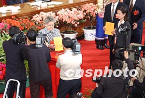 十屆全國人大一次會議第七次全體會議三月十七日在北京人民大會堂舉行,新當選的國務(wù)院副總理吳儀參加投票。作者:盛佳鵬