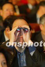 十七日下午,一名出席十屆全國人大一次會議第七次全體會議的香港代表用望遠鏡觀看主席臺,關注新一屆政府組成人員。作者:毛建軍