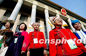 十屆全國人大一次會議十八日在北京閉幕,少數民族代表談笑著離開會場。作者:鄭萍萍