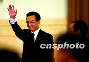 新任國務院總理溫家寶十八日在北京召開記者發布會,揮手向記者致意。作者:鄭萍萍